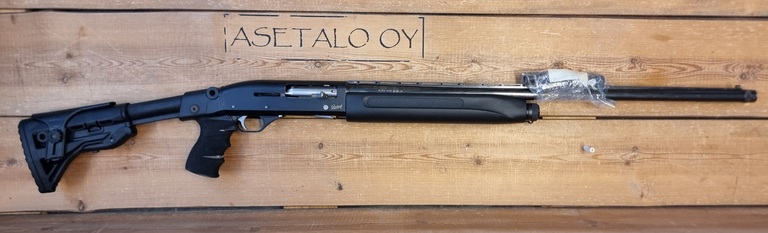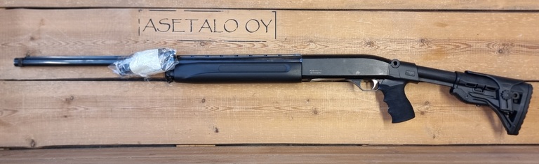 Käytetty MP-153 DLG Tacticalin pistoolikahvallisella teleperällä.
