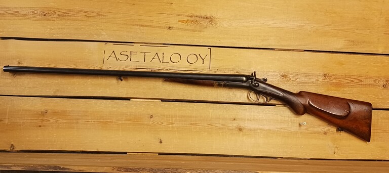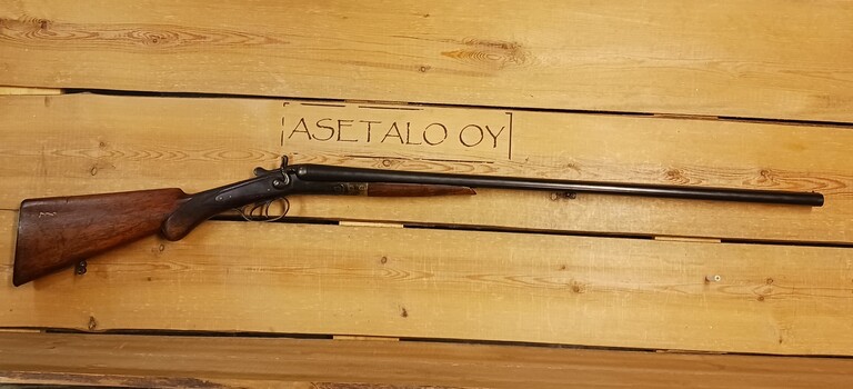 Hyväkuntoinen vanha rinnakkaispiippuinen hanallinen haulikko. Kal 16, piipun pit. 75,5cm,