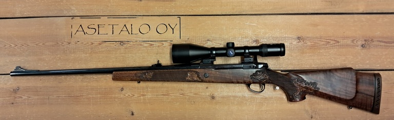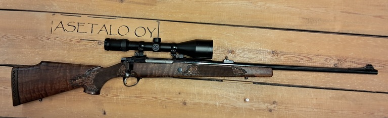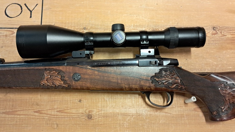 Kuin uusi Sakon Super Deluxe kaliperissa .30-06. Mukana Zeissin Diavari V 3-12x56 T -kiikari Apelin laatujaloilla. Keräilyarvoa on, loistokunto.