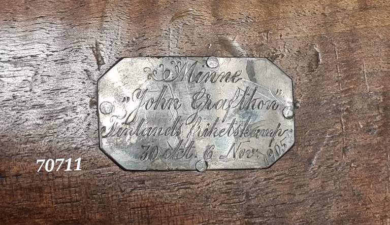 Hyväkuntoinen Sveitsissä tehty Vetterli kivääri, numerotarkka. Perässä vanha muistolaatta: "Minne(Minna?) "John Grafton" Finlands Frihetskamp 30 okt. 6 Nov. 1905" eli suurlakon päivämäärät. On syytä epäillä että kyseessä on Grafton-kivääri, muistaen että Grafton laiva upposi syyskuussa 1905. Keräilykappale.
