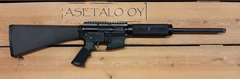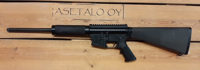 AR 15 tyylinen rakennettu pienoiskivääri minirifle sarjaan. S&W M&P-15 alakerta kivääriperällä, V22 22LR yläkerta, 1/2-20 ääva kierre, mukana 1 kpl Black Dog lipas.