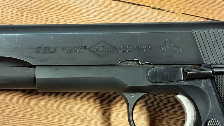 Harvinainen Colt Ace-pienoispistooli. Kahvat vaihtuneet.