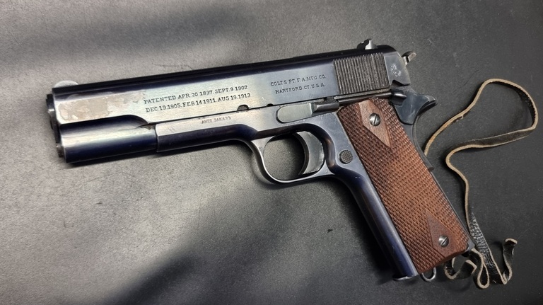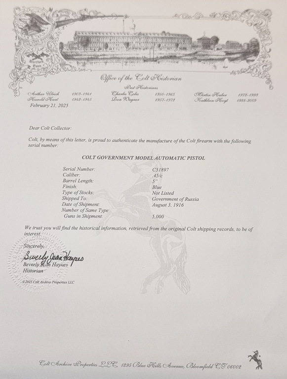 Siistikuntoinen Venäjän coltti, luisti ottanut hieman pinnoitetta sodan melskeessä mutta alkuperäinen sinistys on loistokunnossa. Venäjän tekstit rungossa. Keräilyharvinaisuus. Entisen omistajan mukaan sukulainen saanut tämän venäläiseltä majurilta lahjaksi sodan jälkeen, tästä ei kuitenkaan mitään todisteita mukana. Siitä kumminkin on Coltin tekemä todistuslappu että tämä ase on lähetetty elokuun 3. päivä 1916 Venäjälle viiden tuhannen muun aseen kanssa.