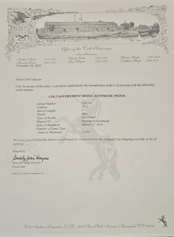 C sarjaa, hyvä kunto, luistin vasen puoli hieman huonompi. Mukana Colt dokumentti jossa todetaan että tämä ase on lähetetty Coltin tehtaalta Venäjälle maaliskuun 31. päivä vuonna 1916 viiden tuhannen muun aseen kanssa.