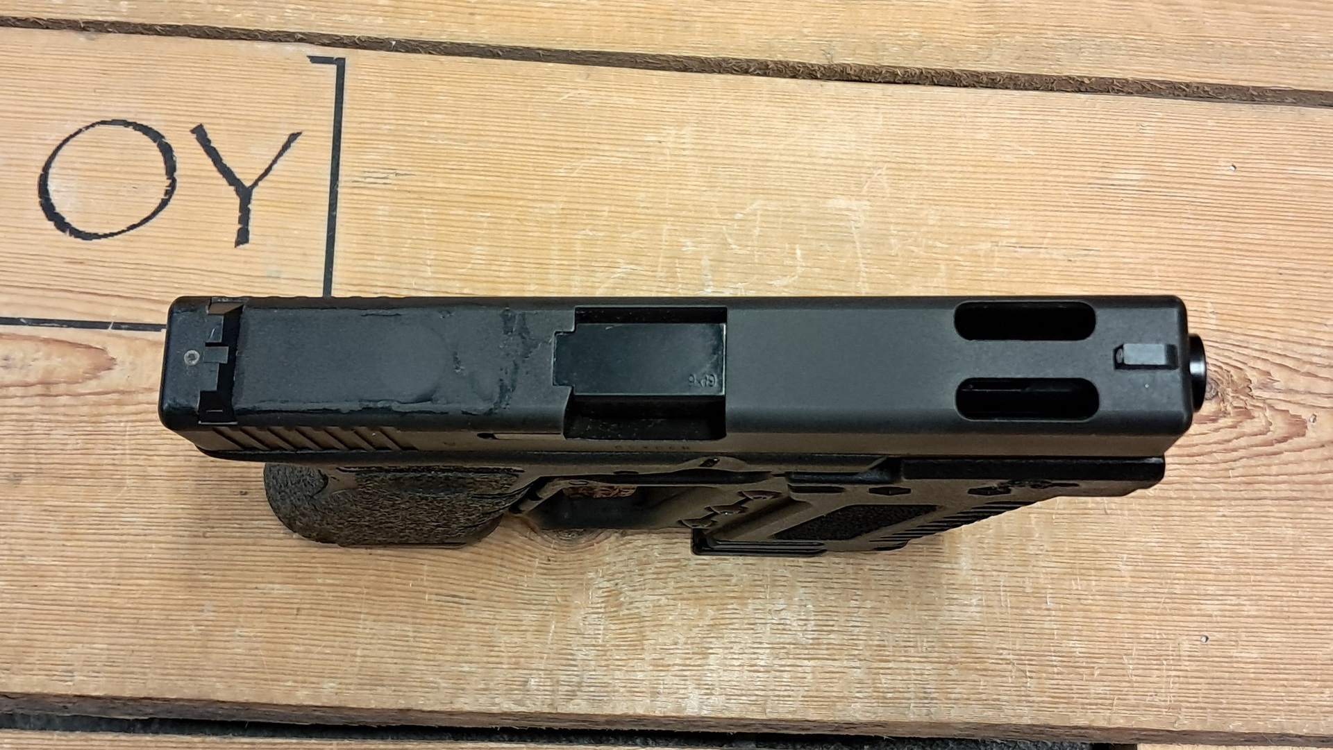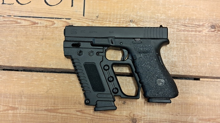C mallin Glock 17 kahvateipeillä ja etukädensijalla jossa varalipas sisällä.
