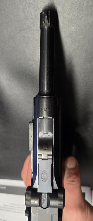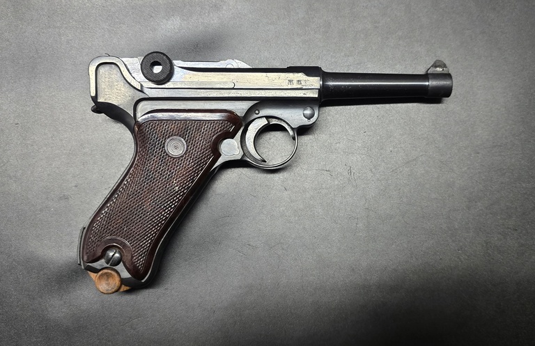 Numerotarkka muuten mutta linkku ja piippu vaihdettu. Löytyy numerotarkka Tikan 9mm piippu kyllä pakettiin, hinta ei silloin ole sama. Nyt paikalla saksalainen siviilimallinen 7,65mm piippu. DDR muovikahvat, uudelleensinistetty.