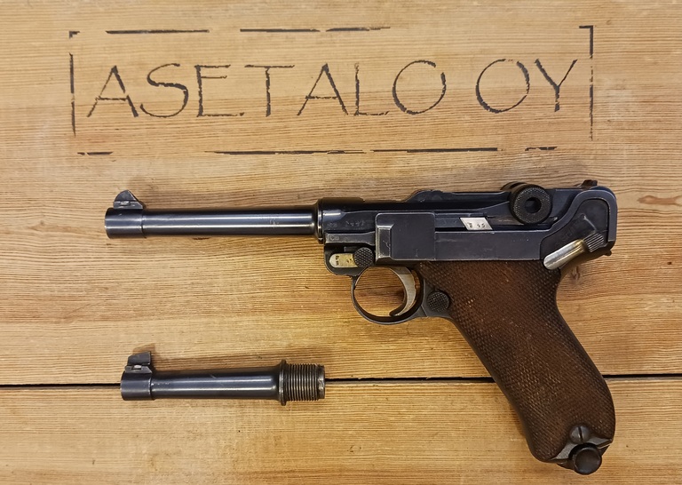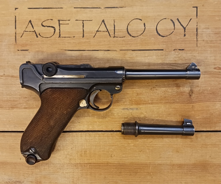 Erfurt Luger pistooli. Togglen takalinkki vaihdettu, muuten täysin numerotarkka lipasta myöten. Aseessa kiinni Tikan piippu jossa rihlat ok, mukaan numerotarkka Erfurt piippu josta rihlat huonommat.
