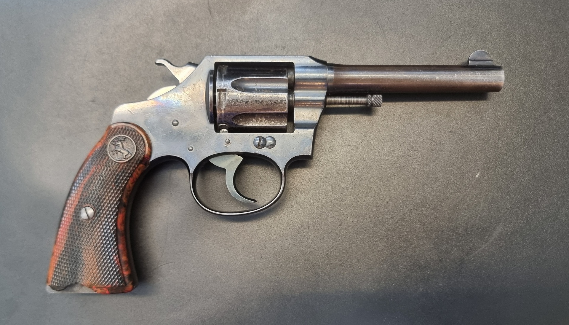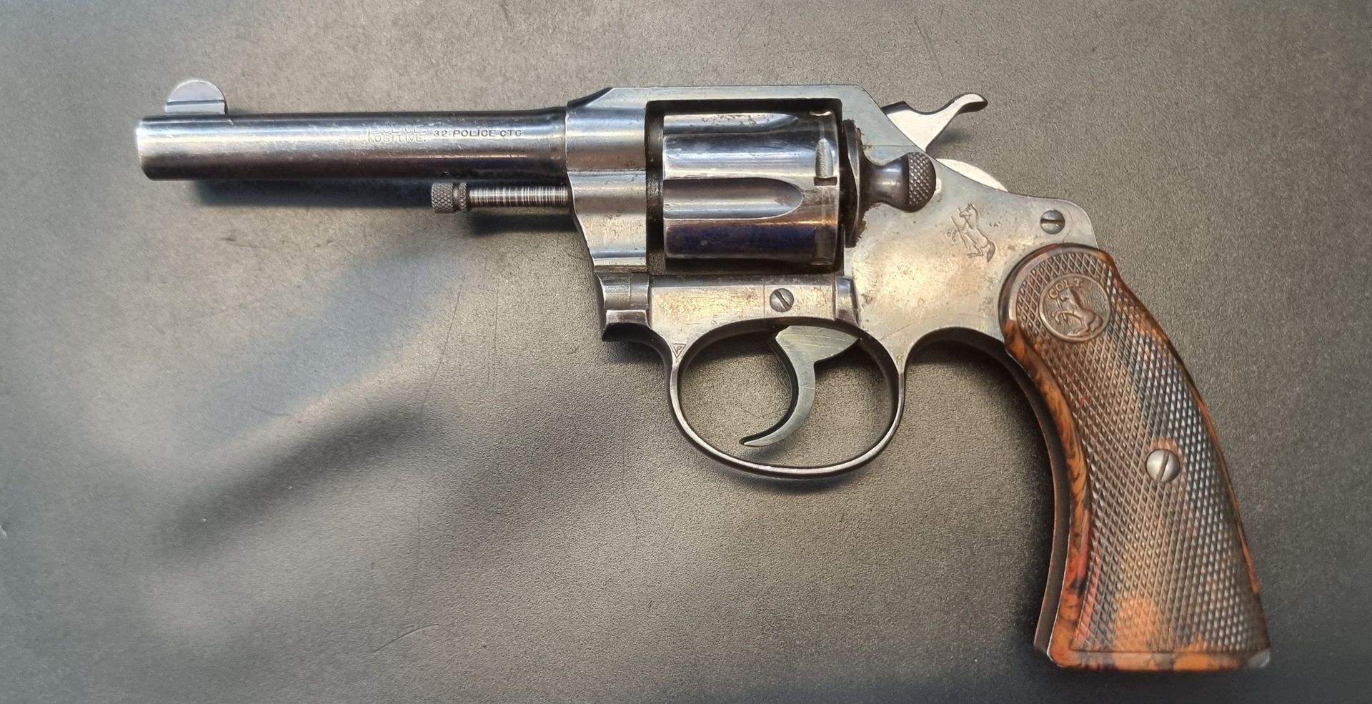 Aika hyvä sinistys ikäänsä nähden, Police Positive joka ollut Kanadan junaviranomaisilla käytössä. Kahvat pohjasta haljennut. Colt tai Kanada keräilijälle oiva laite.