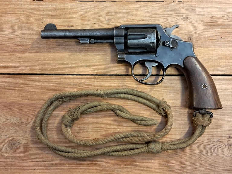 Harvinaisempi 5" versio. Brittien leimat eli varmaankin viety sodan alussa Britteihin. Jenkit tykkäsi enemmän .38 Specialista ja Britit .38 S&W:stä. U.S Property leima, todennäköisesti alkuperäinen naru!
