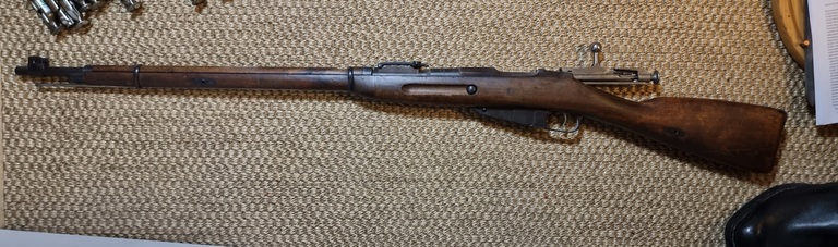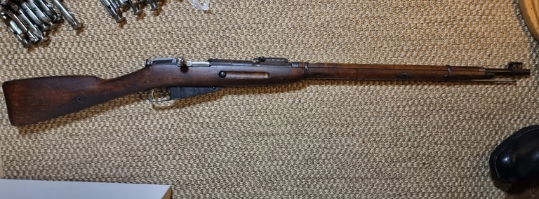 Äänislinna karbiini M91, armeijan peruskorjaama. Äänislinnassa laitettiin muutamaan M91 rakuunakivääriin etutähtäimen pystykorvat, tämä yksi niistä. Keräilyharvinaisuus, upea kunto.
