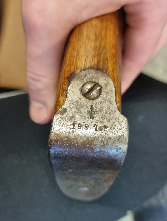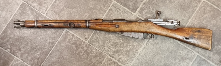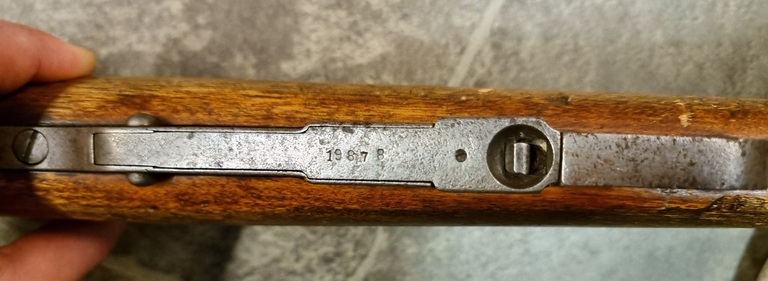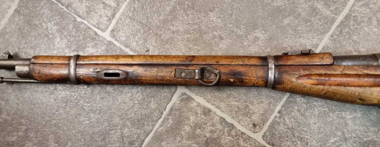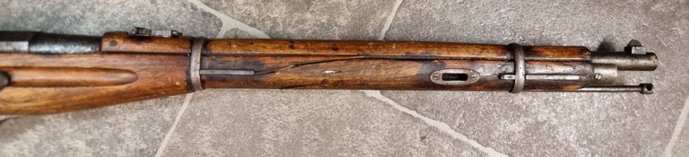 Etutukki halki, piippu tiukka mutta sisältä musta, itse tehty hihnan etulenkki. Harvinainen M1907 karbiini.