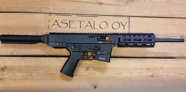B&T:n valmistama 9x19 kivääri. Piipun pituus 300 mm, 1/2x28 kierre piipun päässä. Käännettävät avotähtäimet. M4 tyyppinen alarunko, johon sopii Glockin lippaat. SD (BT-450136) etukädensija/händeri vaimentimen äärimmäisen kaunista asennusta varten. M4 bufferituubi (BT-450286) niin voit valita haluamasi perän. Mukana hihna, laukku ja luvan mukainen lipas. Piipussa kierre 1/2x28 jos menee tälläisenään.