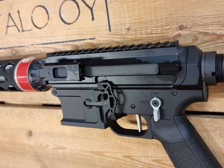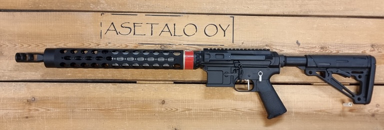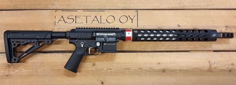 JP suunnitteli sivusta viritettävän kilpa-arskan nopeampia latauksia varten. Tässä malliss yli-iso lippaanvapautin, 90 asteinen varmistin, JP komppi, 16" piippu (kevyt!), luistinvapautinsalpa jatkettu etusormelle, Hogue pistoolikahva, Hogue teleperä, JP MK III Hand Guard System, JP säädettävät kaasut, LMOS -bolt carrier, kahdella 10 ptr lippaalla.
