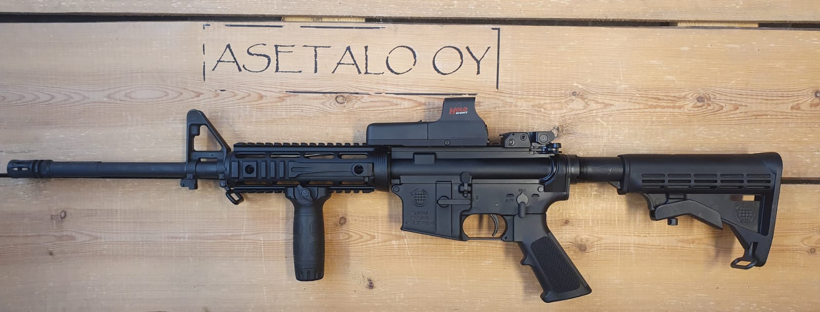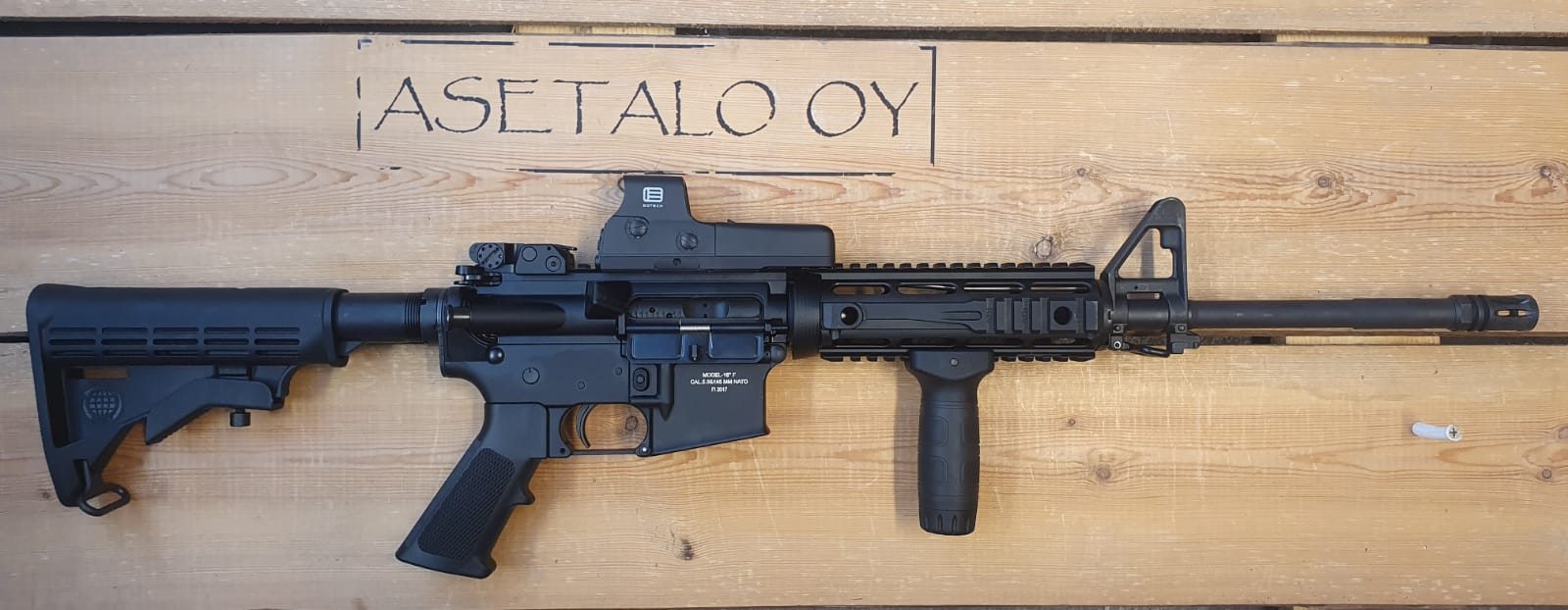 Israelilainen AR15 karbiini. 16" kovakromattu piippu. 2 lipasta, etukahva, alumiinen etukahva kiskoilla.