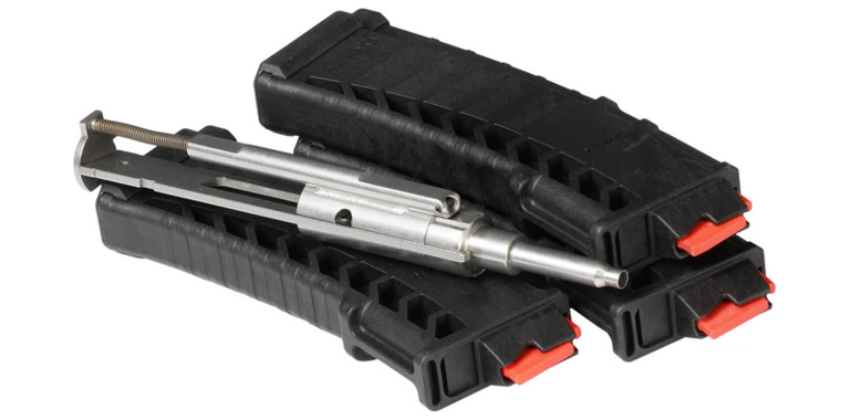 Vaatii kaksi aseen osan lupaa, sulkulaite sekä patruunapesä. Toimitetaan kolmella lippaalla