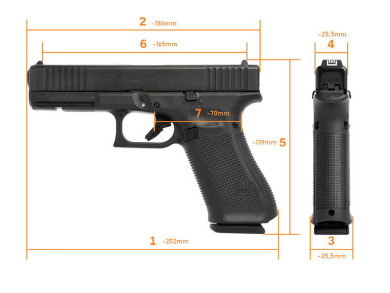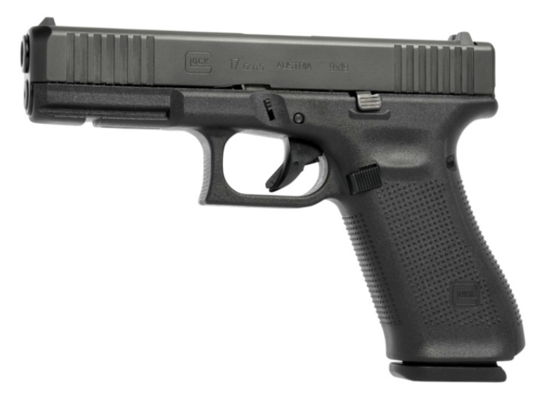 Glock 17 Generation 5. FBI:n kilpailutusmallin siviiliversio.Tässä mallissa mm uusi tarkkuuspiippu, kestävämpi nDLC-viimeistely piipussa ja luistissa, molemminpuolinen luistinvapautin. Lippaassa oranssinen patruunan nostin, isompi mag-well. Lisäksi säädettävät kahvalevyt (kuten Gen4) ja isompi lippaanvapautinsalpa.