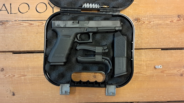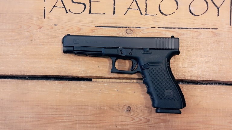 Pitkäluistinen kal 45 ACP Glock pistooli.