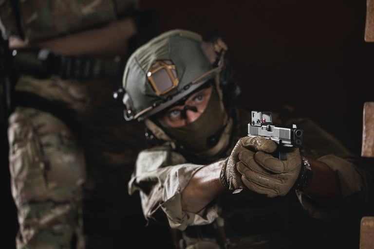 Glock ja Aimpoint on tehnyt yhteistyössä uuden punapisteen ja sen kiinnitysjärjestelmän Glockiin! Glock A-Cut COA Combo -pistoolien luisteissa on uniikki leikkaus punapisteen kiinnitykseen joka sijoittaa punapisteen alemmas kuin normaalisti, ns. syvemmälle luistiin ja madaltaa näin yhdistelmän profiilia ja mahdollistaa co-witness tähtäyksen, kiinnitys myöskin helpompaa ja punapiste pysyy entistä paremmin kiinni, eikä tarvita sovitelevyjä. Aimpoint COA on uusi suljetun mallin punapiste isolla linssillä ja ohuemmilla kehyksillä varta vasten tähän kombinaatioon tehty, 3,5 MOA piste, virtalähde CR2032 paristo. Pariston voi vaihtaa punapisteen ollessa kiinni aseessa. Vedenkestävä 25 metriin, käyttöaika 50 000 tuntia, perus Aimpoint lukemia siis. Pieni ja näppärä pp, 45 x 28 x 30 mm mitat ja painoa vain 48 grammaa. Melkein 2x ohuempi kehys kuin Acrossa ja esim. Glock 45 mallissa punapiste ei ole luistia leveämpi. Kiinnityssysteemissä takatähtäin on osa punapisteen kiinnitystä, toimii kuin kynsi, torxeilla kiinni luistiin. A-Cut COA Comboa saa 9mm Gen 5 malleissa Glock 19 (taskuase), Glock 45, Glock 47, Glock 43X (taskuase) ja Glock 48 (taskuase). A-Cut luisteja ja Aimpoint COA tähtäintä ei saa erikseen, tavara myydään yhdistelmätuotteena, pistoolina. Itse ase perus M45, kahdella lippaalla, luistin ja piipun mitta G19 mitoissa. Runko noin G17 mitoilla. Luistissa karhennukset etupäässä.
