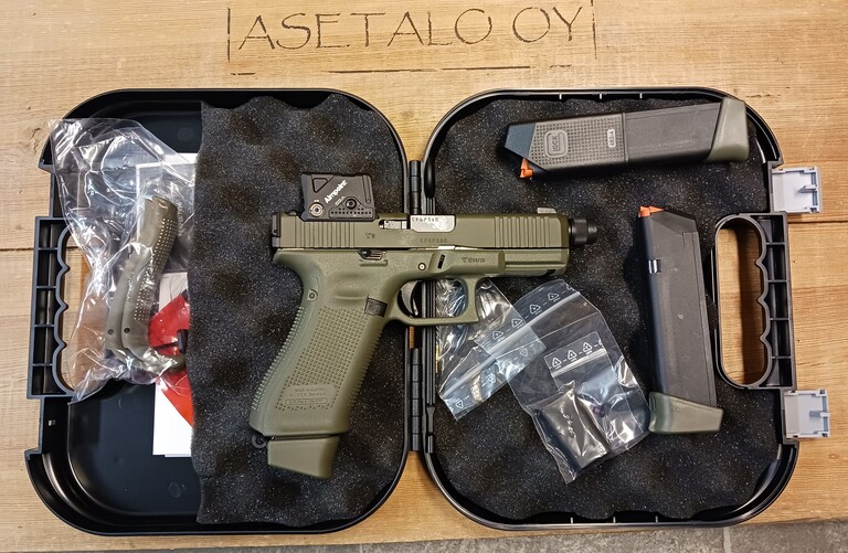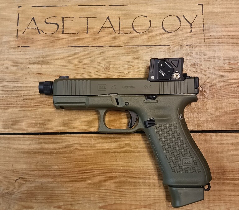 Glock Hunter Edition sarjan M45 pistooli 13,5x1 LH kierrepiipulla. Kal 9x19, Aimpoint COA valopistetähtäimellä.