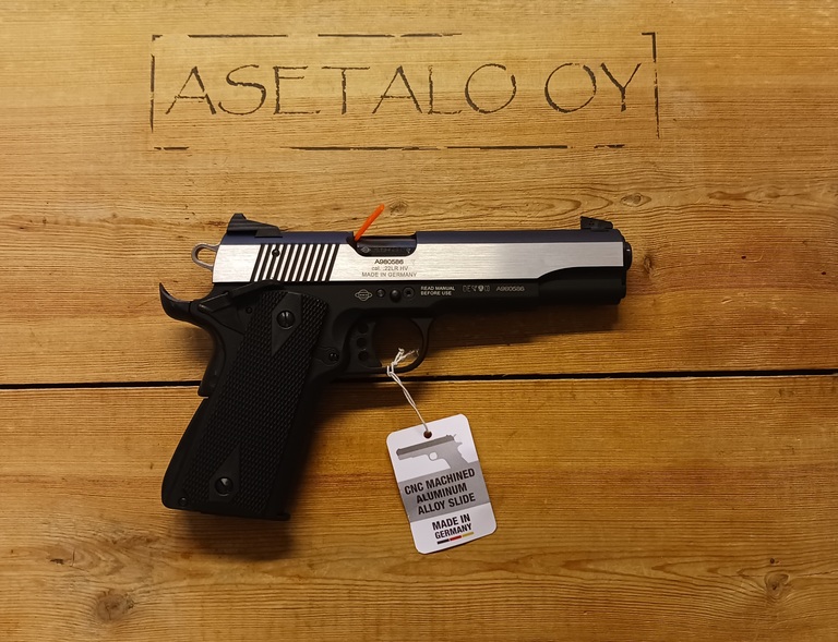 1911 mallinen 22LR pienoispistooli, tässä mallissa 2-puoleinen varmistin ja liipasimessa jälkivedon säätöruuvi. Mukana yht. 1kpl 10ptr lipas, eri korkuisia etujyviä, työkalu vaimennin kierreadapterin suojamutterin irrotukseen. Paino 994g. Mallinimi "Stainless" tulee luistin kiiltäväksi hiotuista kyljistä, luistin materiaali kutenkin alumiinia!