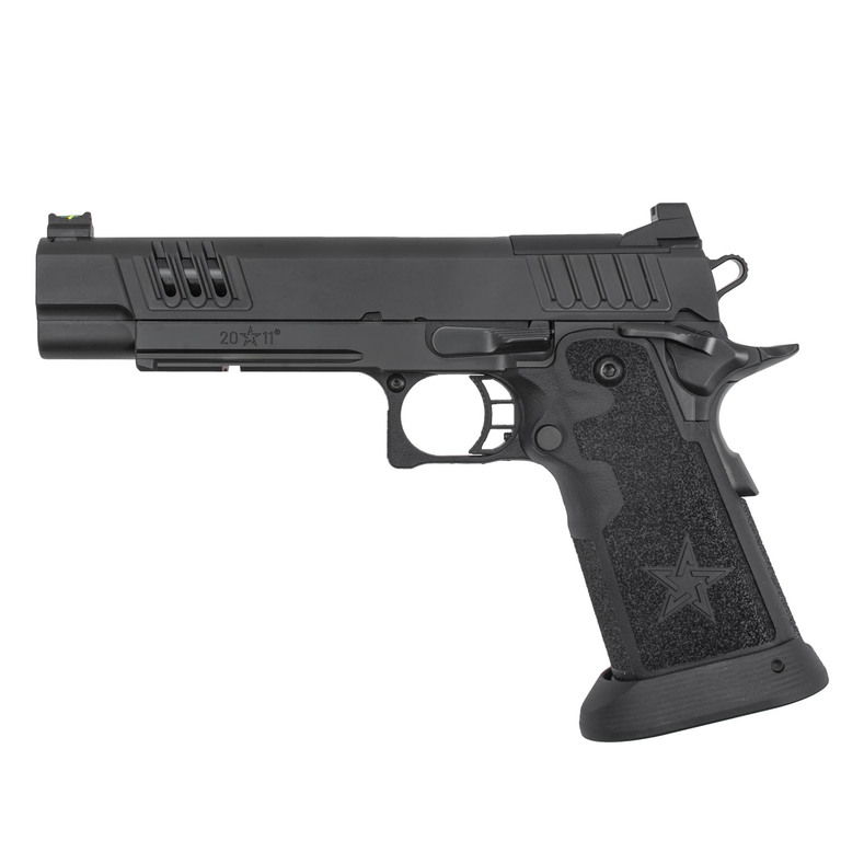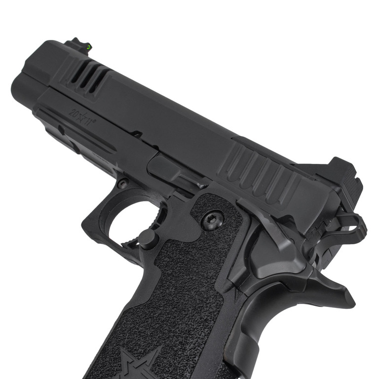 Laadukas Staccato 2011 kilpapistooli. 5,4" DLC pinnoitettu bull barrel piippu, Dawson Precision kuitujyvä, Dawson Precision Charger takatähtäin, punapistevalmius. Magwell, 2011 stiplatut kahvat ja ambi varmistin. Laukaisu 1,13 kg. Kokonaispituus 231mm, leveys 38mm, korkeus 150mm, paino 1077 g. 2 kpl 17 ptr lippaita mukana.