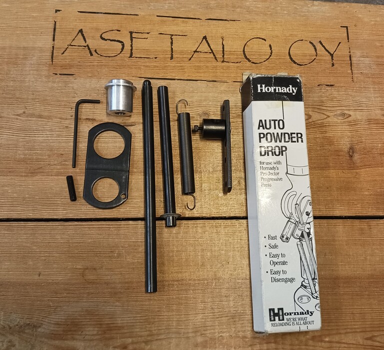 Automaattinen ruudin annostelijan käyttövivusto Hornadyn Pro-Jector progressiviseen lautauspuristimeen, tällä systeemillä voi käyttää tässä puristimessa myös RCBS:n tai Reddingin ruutiannostelijaa. Mukana kuvitettu englannin kielinen asennusohje.