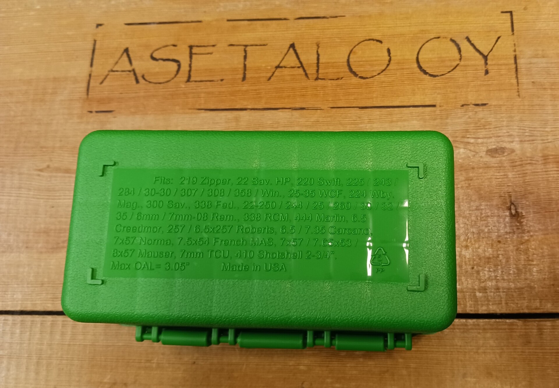 Patruunarasia 50:lle 243/284/30-30/307/308/358Win, 25-35, 22-250Rem, 7mm-08Rem, 444Marlin, 6,5Creedmoor, 7x57, Max patruunan pituus (OAL) 3.05" n. 77,5mm.