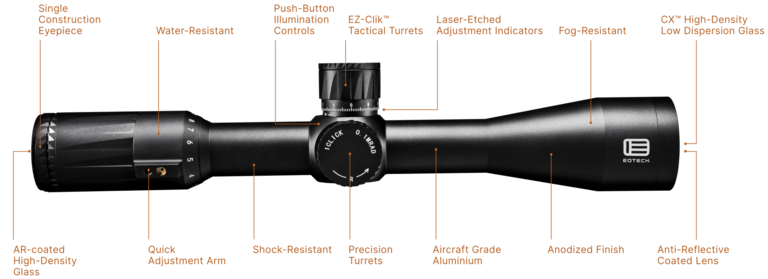 Eotech Vudu 3,5-18X50 omaa vankan 34 mm:n runkoputken, XC High-Density -lasin, ja siinä on muita suorituskykyominaisuuksia, joita tarvitaan tarkan pitkän kantaman laukaukseen. Ylimitoitettujen ja tarkasti työstettyjen tornien, joissa on EZ Chek Zero Stop -ominaisuus, voit nopeasti valita säädöt ja palata nollaan jopa hämärässä. Sivulle asennetun parallaksisäädön avulla voit helposti valita ristikkotarkennusta. Milliradiaani (MRAD) ristikko. Mukaan tulee käyttöopas, ristikko-opas, throw lever, linssien puhdistusliina, zero stop wrench, CR2032 paristo. Pituus 384mm, paino 952g, suurennos 3,5x18, runkoputken halkaisija 34mm, objektiivin halkaisija 50mm, eye relief: 3.5X: 3.58-3.97" (91-101 mm), 18X: 3.54-3.97" (90-101 mm)