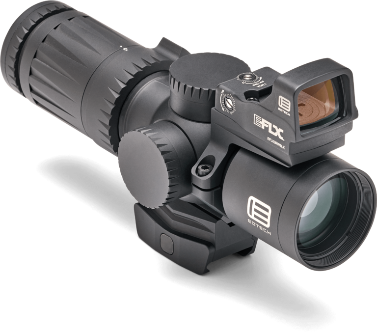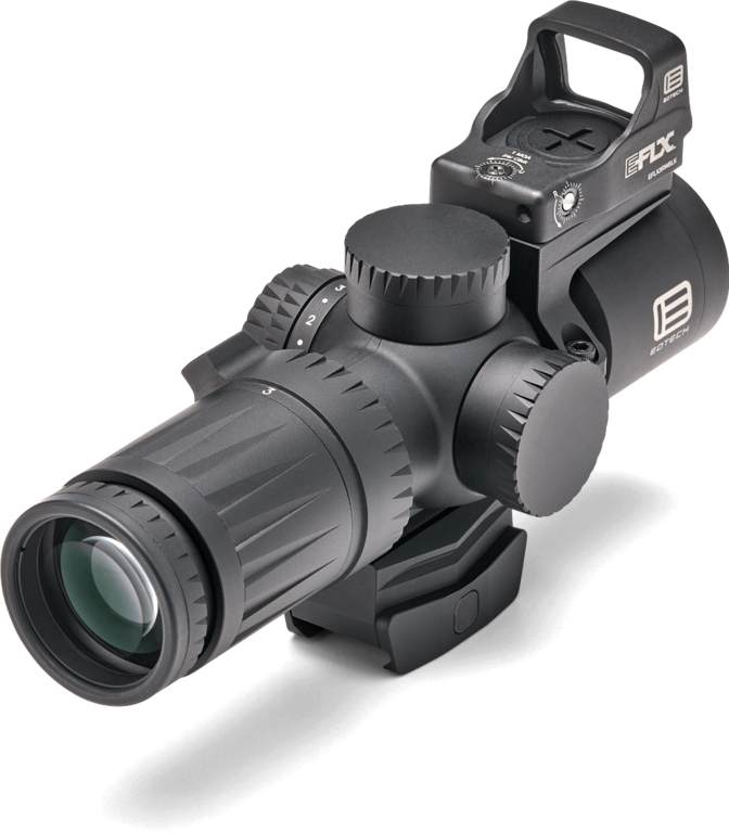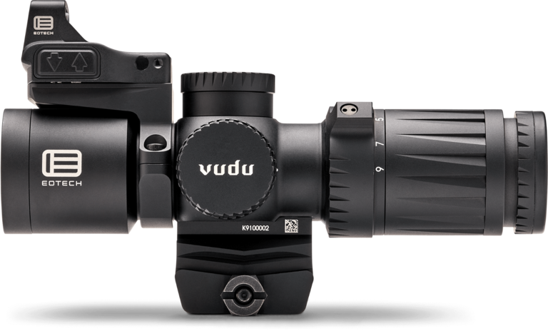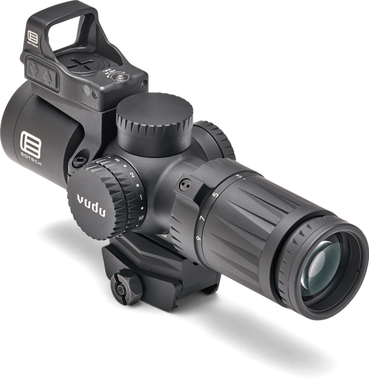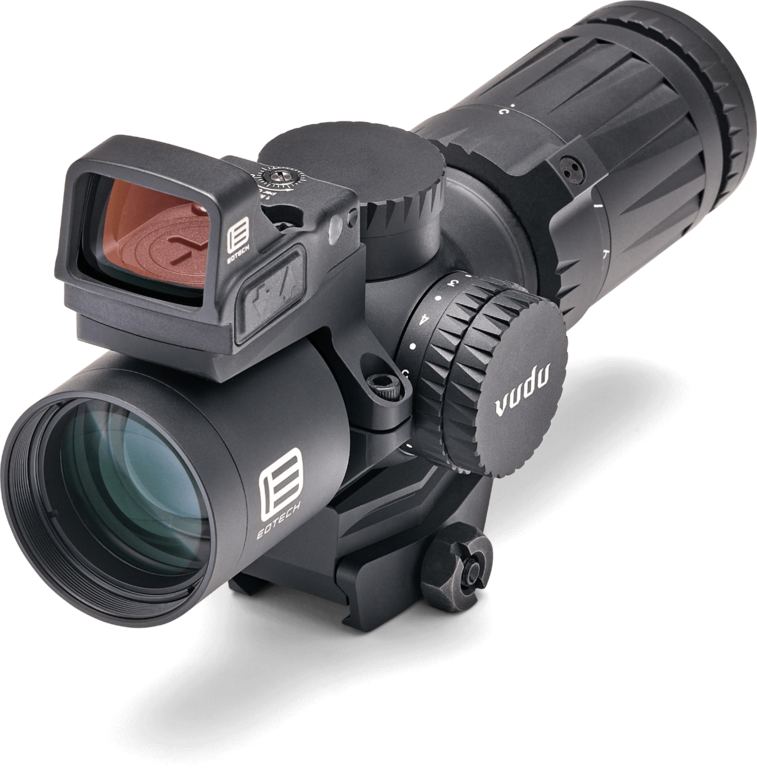 Eotechin uusi ultra-short kiikari + punapiste, mukaan tulee kiikariin kiinni asennettava Eotech EFLX 3 MOA punapiste! Paketissa siis Vudu, sen jalka, EFLX punapiste ja sen kiinnitysrengas. Punapisteen asennon voi itse valita. Vain 172,70mm pitkä ja 454 grammaa painava. Tähtäimessä kiinteä jalka joka sopii suoraan picatinnykiskoon tai muihin mini-ACOG jalkoihin. Toisen polttoasteen valaistu HC-1 ristikko kymmenellä kirkkaussäädöllä. Sumun, veden ja iskunkestävä. ¼ MOA säädöt, toimii CR2032 paristolla jolla noin 300 tuntia valoa ristikkoon.