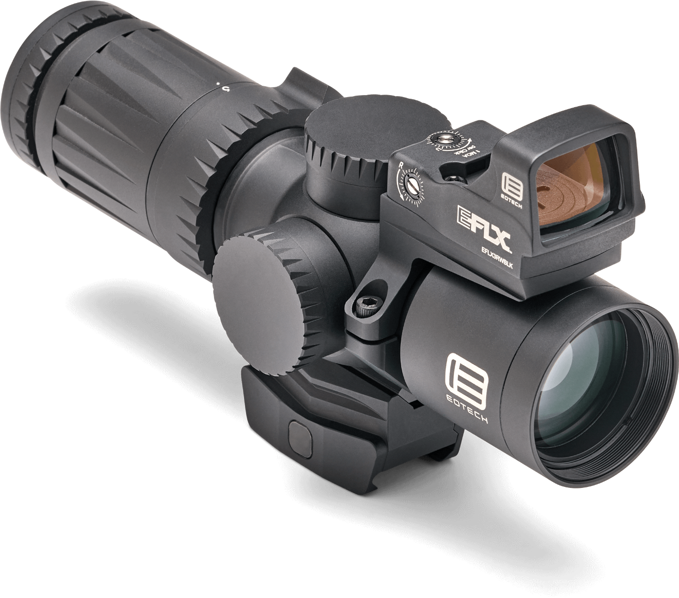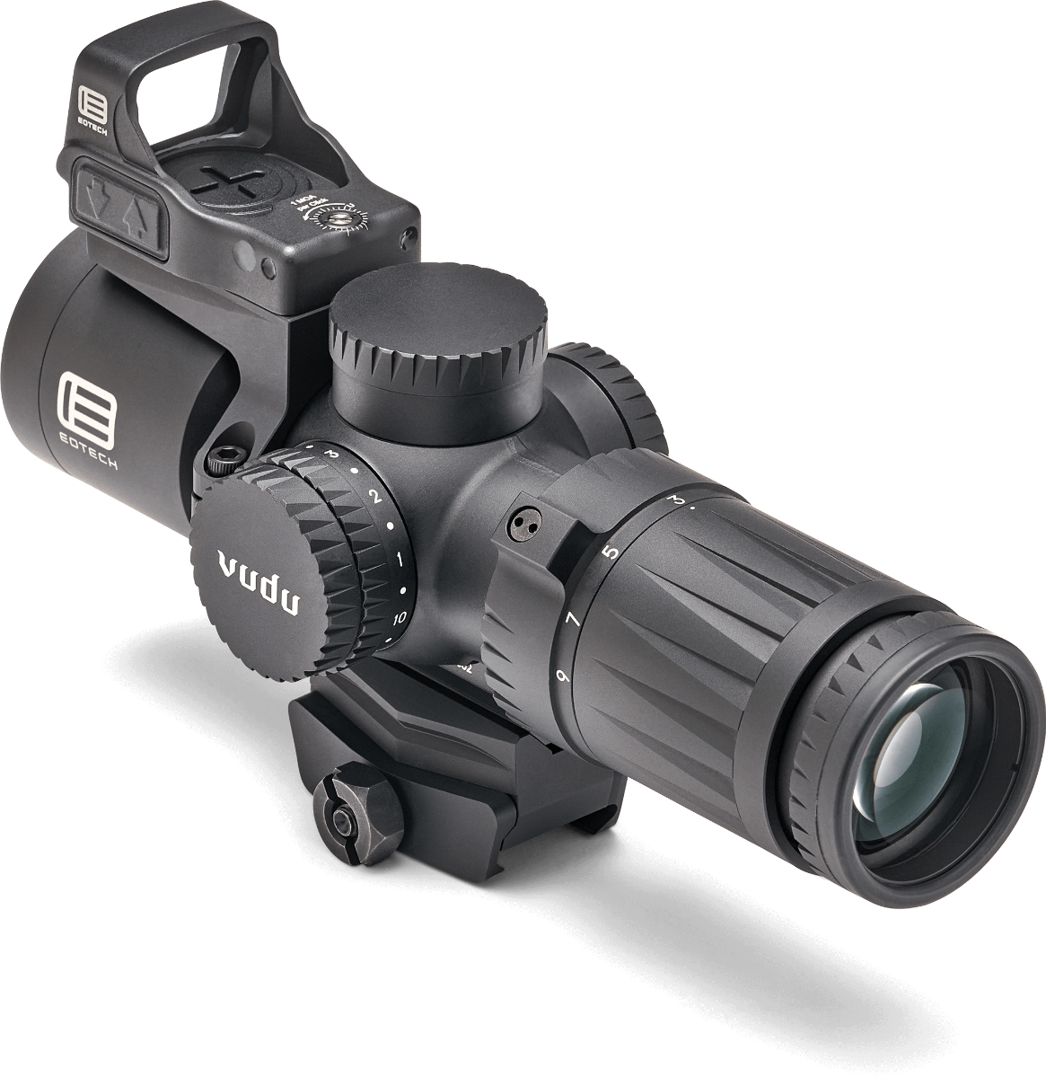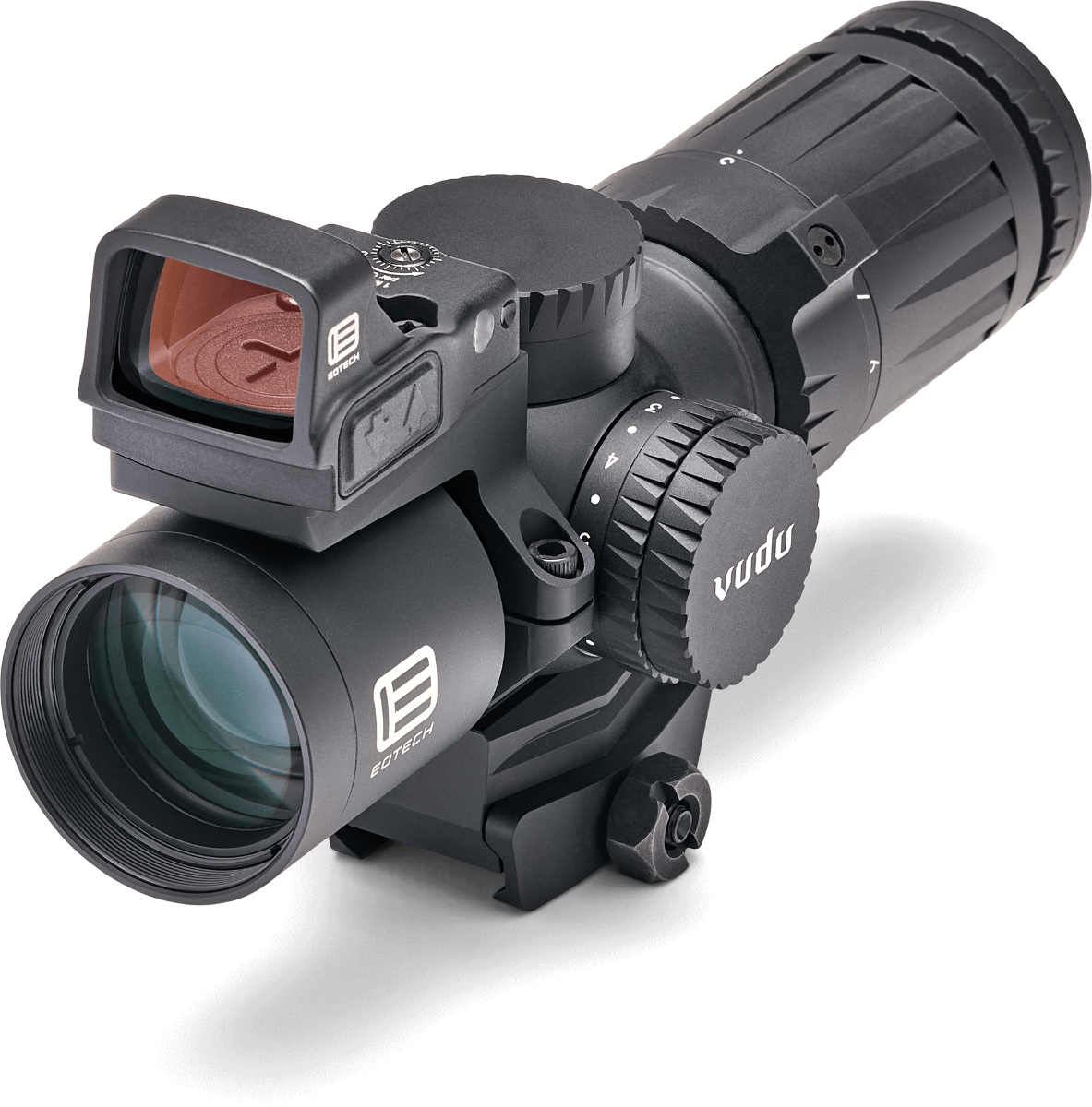Eotechin uusi ultra-short kiikari + punapiste, mukaan tulee kiikariin kiinni asennettava Eotech EFLX 3 MOA punapiste! Paketissa siis Vudu, sen jalka, EFLX punapiste ja sen kiinnitysrengas. Punapisteen asennon voi itse valita. Vain 172,70mm pitkä ja 454 grammaa painava. Tähtäimessä kiinteä jalka joka sopii suoraan picatinnykiskoon tai muihin mini-ACOG jalkoihin. Toisen polttoasteen valaistu HC-1 ristikko kymmenellä kirkkaussäädöllä. Sumun, veden ja iskunkestävä. ¼ MOA säädöt, toimii CR2032 paristolla jolla noin 300 tuntia valoa ristikkoon.