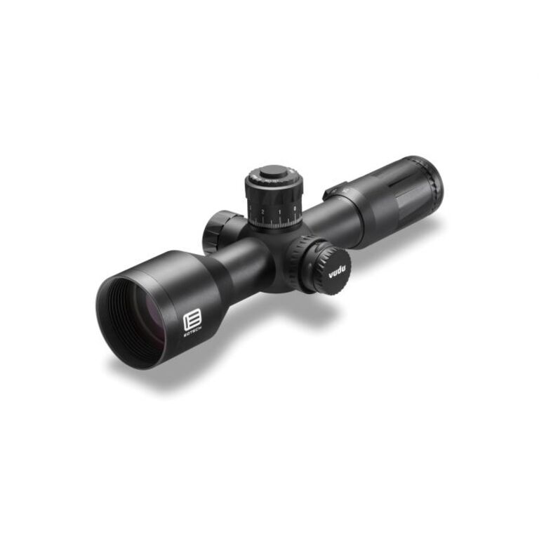 Vudu 5-25X50 on ihanteellinen lyhytalustaisille kivääreille. Noin 11,2 tuuman pituinen 5-25X on yksi markkinoiden lyhyimmistä ensimmäisen polttotason kiikareista. Torni sisältää työntö-/vetolukitusjärjestelmän ja EOTECHin EZ Chek Zero Stopin. Yksi lyhyen suunnittelun ainutlaatuinen etu on, että sen avulla voidaan kiinnittää joko kiinnitettävä pimeänäkö- tai lämpölaite kiikaritähtäimen eteen ja muutakin jos kiskoa riittää. MRAD -asteikko ristikossa. Mukaan käyttöopas, ristikko-opas, throw lever, aurinkosuoja, linssien puhdistusliina, CR2032 paristo, Zero stop -avain. 285mm pitkä, paino 835g, suurennos 5-25x, runkoputken halkaisija 34mm, objektiivin halkaisija 50mm, eye relief 5X: 2.96-3.71" (75-94 mm),