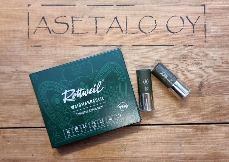 Rottweilin tungsten -haulikon patruuna. 2,7mm haulit, rasiassa 10 kpl. Paketin mukaan riistalle tappava yli 55-60m matkalle.
