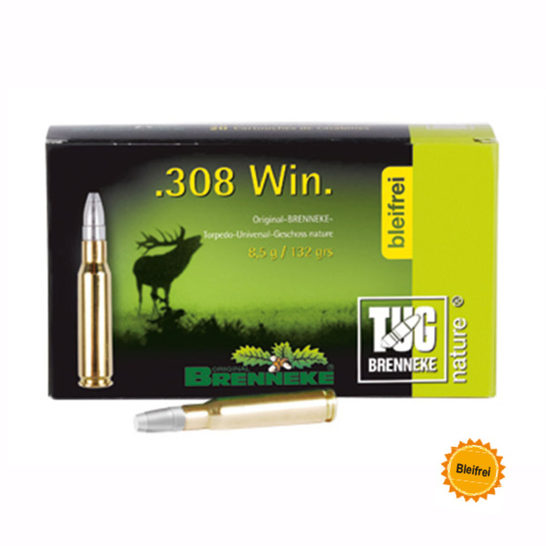 Brenneke .308 Win patruuna LYIJYTTÖMÄLLÄ TUG Nature + -luodilla. Maailman ensimmäinen lyijytön metsästyspatruuna ja Brenneken valmistamana se toimii. Haulikon täyteisten kehittämisen edelläkävijän ja sen valmistuksen ensimmäisenä aloittaneen Brenneke:n mullistavat lyijyttömät patruunat koostuvat kupari-nikkeli päällystetystä luodista jonka ydin on myrkytöntä tinaa. Tämä yhdistelmä takaa pysäyttävää voimaa ja eläimen nopean lopetuksen. Soveltuu suuremmalle riistalle. Luodin paino 9,5g, lähtönopeus 857 m/s. 20kpl/rasia, 100kpl/laatikko.