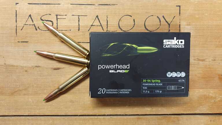 Sako:lta uusi lyijytön metsästyspatruuna Powerhead Blade 11g kupariluodilla. Lähinnä hirvi-, peura- ja karhuluoti. Lähtönopeus 860 m/s, .30-06 Springfield