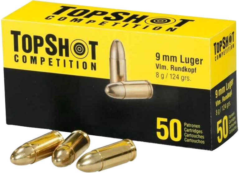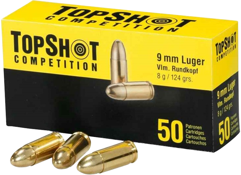 Topshot Competition 9mm pistoolin patruuna, ladattu tsekeissä ( Sellier & Bellot) 8g kokovaippaluoti, 50 kpl rasia. Lähtönopeus 377 m/s.