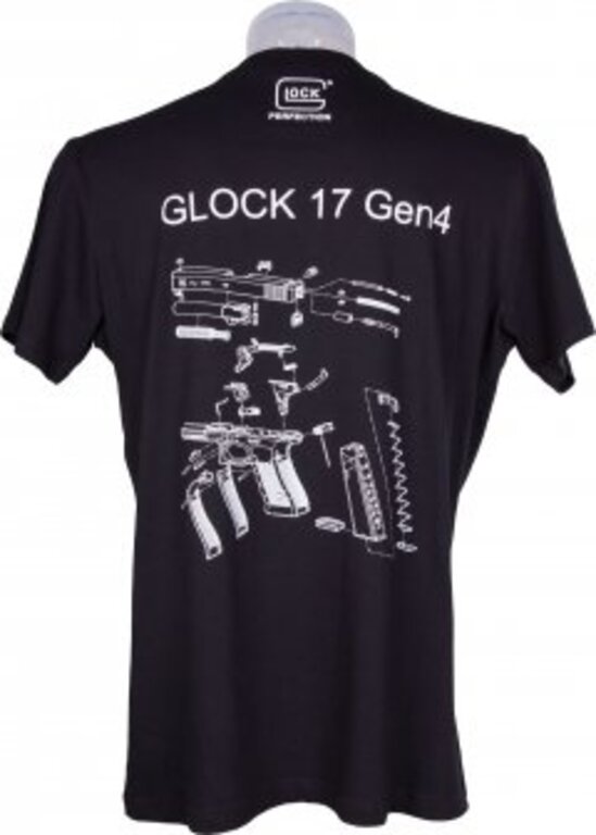 Miesten musta t-paita, koko S. Selässä Glock 17 Gen 4 räjäytyskuva.
