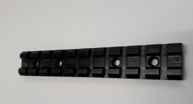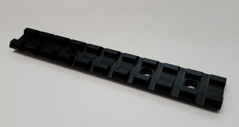 Tozin valmistama weaver/picatinny-kiskoaihio. Tasapohja ja kiinnitysruuveille porattu reiät.