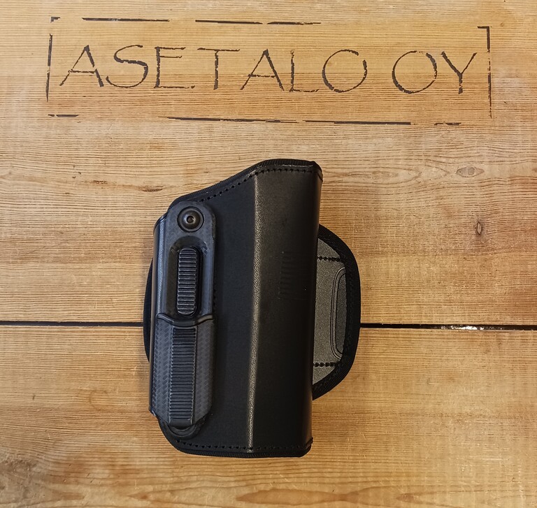 Pistoolin lukituksen vapautus sivulla olevasta napista etusormella, sopii 50mm vyölle