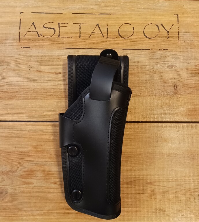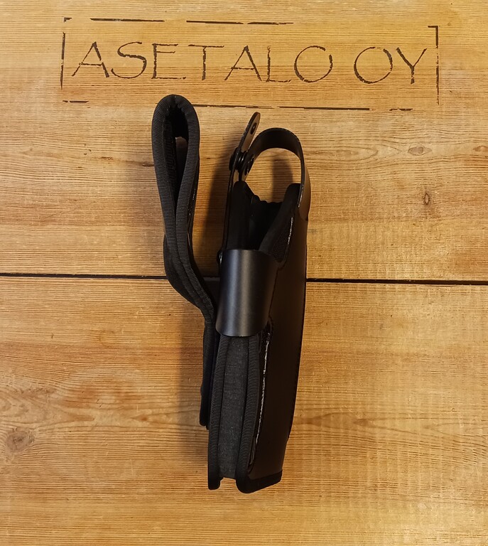 Materiaali Nylon / Cordura, ase lukittuu paikalleen nepparikiinnitteiselle remmillä, vapautus ampumakäden peukalolla