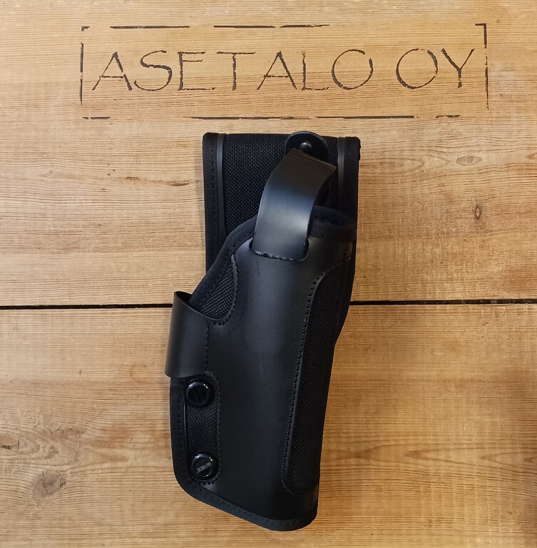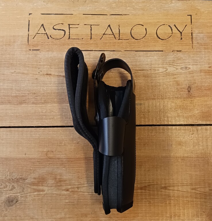 Materiaali Nylon / Cordura, ase lukittuu paikalleen nepparikiinnitteisellä remmillä, vapautus ampumakäden peukalolla
