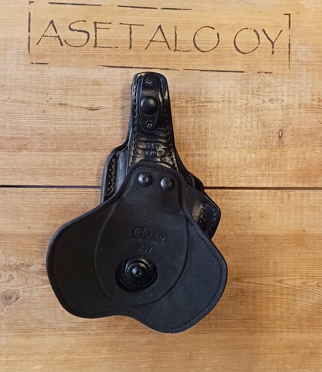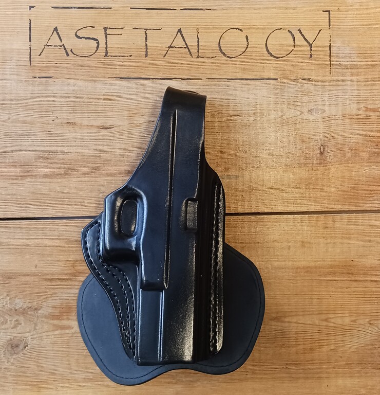 Materiaal nahkaa, pistoolin lukitus nepparilukitteisella remmillä, kotelo kiinnittyy housunkauluksen sisäpuolelle leveällä Paddlellä, Glock 17, 22,