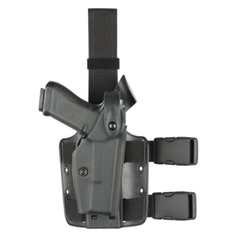 Safariland Glock 17 taktinen reisikotelo. Kotelossa on itsestään lukittuva SLS-järjestelmä, joka pitää aseen napakasti paikallaan mahdollisissa aseenriistotilanteissa ollen samalla erittäin käyttäjäystävällinen helppoutensa vuoksi. Kotelon yläosassa on lisäksi kääntyvä varmistusläppä vauhdikkaampaankin menoon. Kiinnitystä varten on kaksi reisivyötä ja kotelon alustasta löytyy reiät lisävarusteita varten.