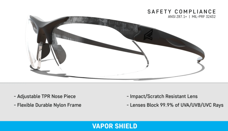 Sharp Edge -ammuntalasit hyvillä ominaisuuksilla, ANSI Z87.1+ high velocity ballistics -luokitellut lasit, ei ole mitkään perus kakkulat. Huurtumisenestotekniikka (Vapor Shield), termoplastinen kumi (TPR) -nenätyynyt, naarmuuntumattomat ja särkymättömät linssit, kestävät ja taipuvat nylonkehykset viittaavat kaikkeen muuhun kuin "aloitustason" ampumalaseihin. Sharp Edget on edullisemmat lasit huippuluokan standardeilla ja ominaisuuksilla. Jokainen Sharp Edgen linssistä estää 99,9 % UVA-, UVB- ja UVC-säteistä ja takaa kristallinkirkkaan optiikan kaikissa olosuhteissa. Ja sen tyylikkäät, matalaprofiiliset sangat integroituvat mukavasti kypäriin tai kuulosuojaimiin. Nämä kestää kauan. ( THIN TEMPLE, SOFT TOUCH MATTE BLACK FRAME, G-15 VAPOR SHIELD LENSES )