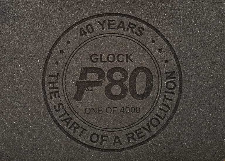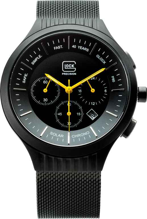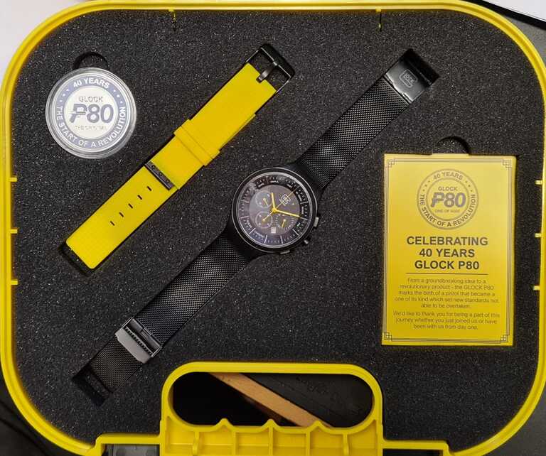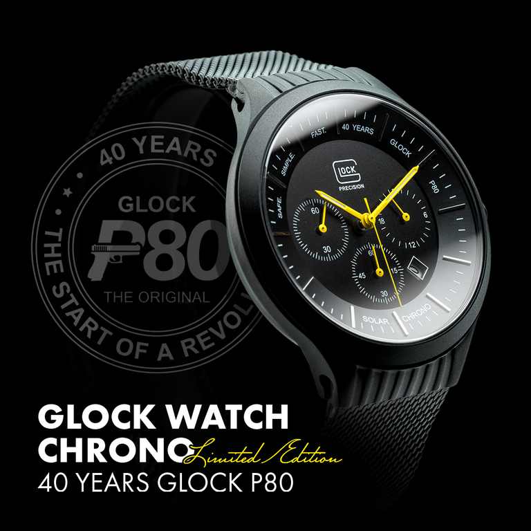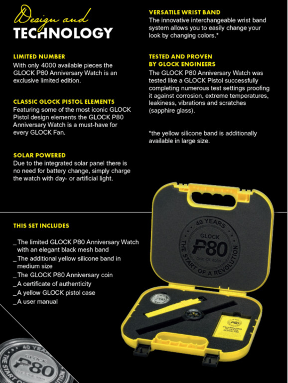 Glockin P80:n (nykyisin Glock 17) julkaisun 40-vuotispäivän kunniaksi Glock toi markkinoille 4000 kpl erän P80 juhlakelloja! Safiirilasi, ajanottofunktio (chronograph), aurinkovoimalla toimiva eli ei paristonvaihtoja, tyylikkäällä mustalla mesh-rannekkeella. Glockin insinöörit testasivat kellot kuin pistoolinsa: monta testiä korroosiosta, vesivuodosta, naarmuista, tärinästä ja äärimmäisitä lämpötiloista ja kello selvisi moitteetta. Mukaan tulee keltainen silikoniranneke, Glock P80 Anniversary -kolikko, aitoustodistus, käyttöohjekirja ja keltainen Glock-laukku. Tuleva keräilyesine, varma harvinaisuus ja jokaisen Glock-fanin pakko-ostos! VAIN 4000KPL maailmassa! Osta omasi!