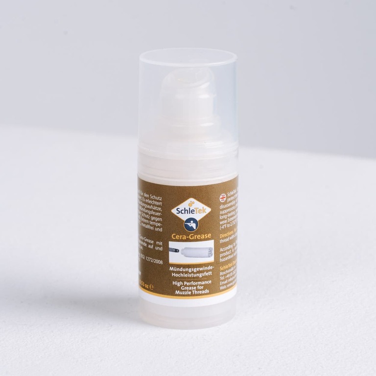 Cera-Grease is specially formulated for use on muzzle threads, adapters and muzzle devices. It perfectly withstands the extreme temperatures generating at the end of the barrel. The high- performance grease is non-toxic, metal-free, based on finest ceramic particles and suitable for any material. Therefore, Cera-Grease can be used even with aluminium parts without hesitation.