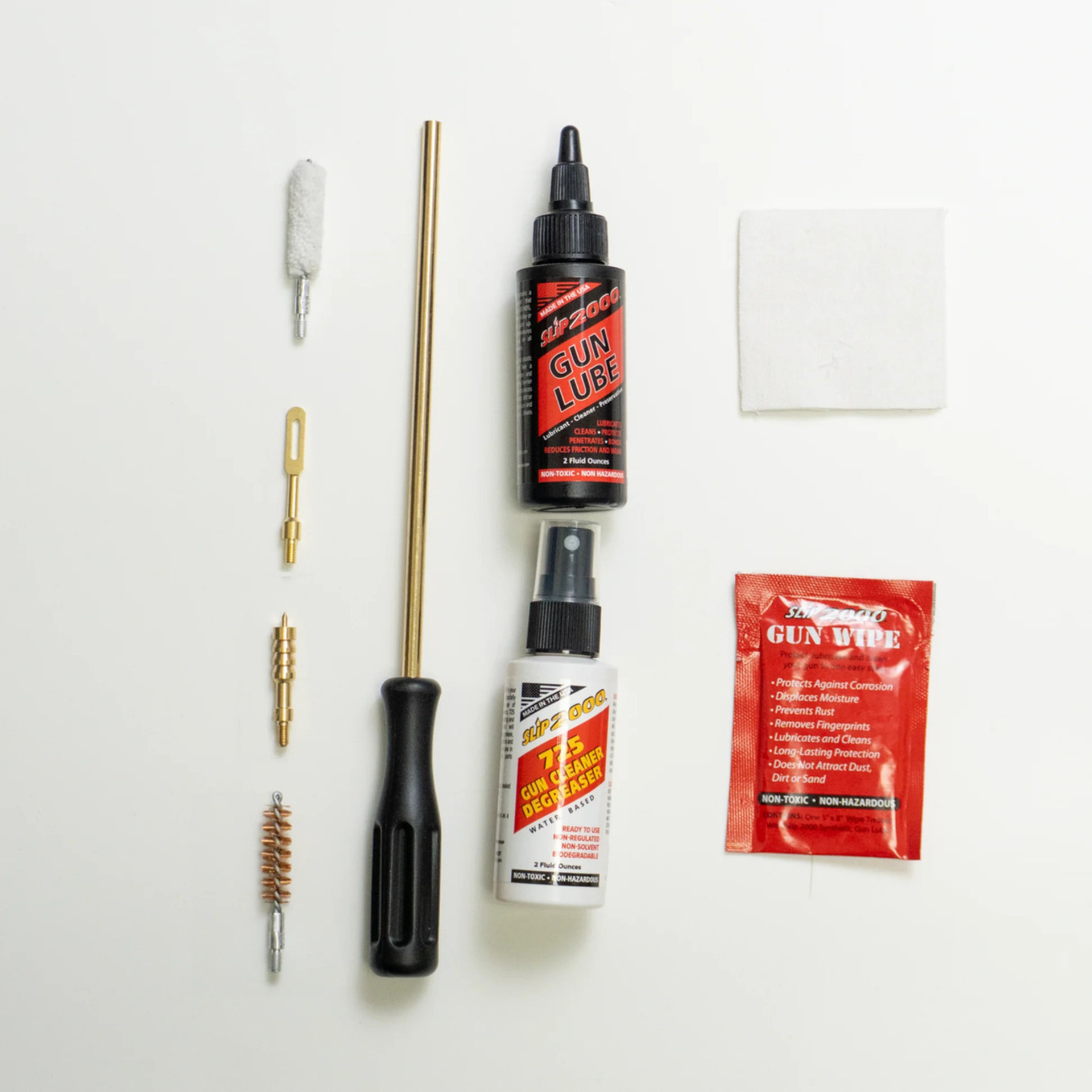 Slip .357/.38/9mm kaliiperien puhdistussarja! Edullinen kokonaispaketti! Sis 3 osainen puhdistuspuikko, kahva, pronssiharja, moppi, messinkipää, lapun pidin pää, 2 Oz aseöljy, 2 oz 725 puhdistusaine, pyyhe, 25 kpl lappuja.