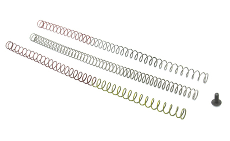 JP Silent Captured Spring vaihtojousia. Väritön kevyin, punainen/väritön toiseksi kevyin ja punakeltainen raskain jousi.